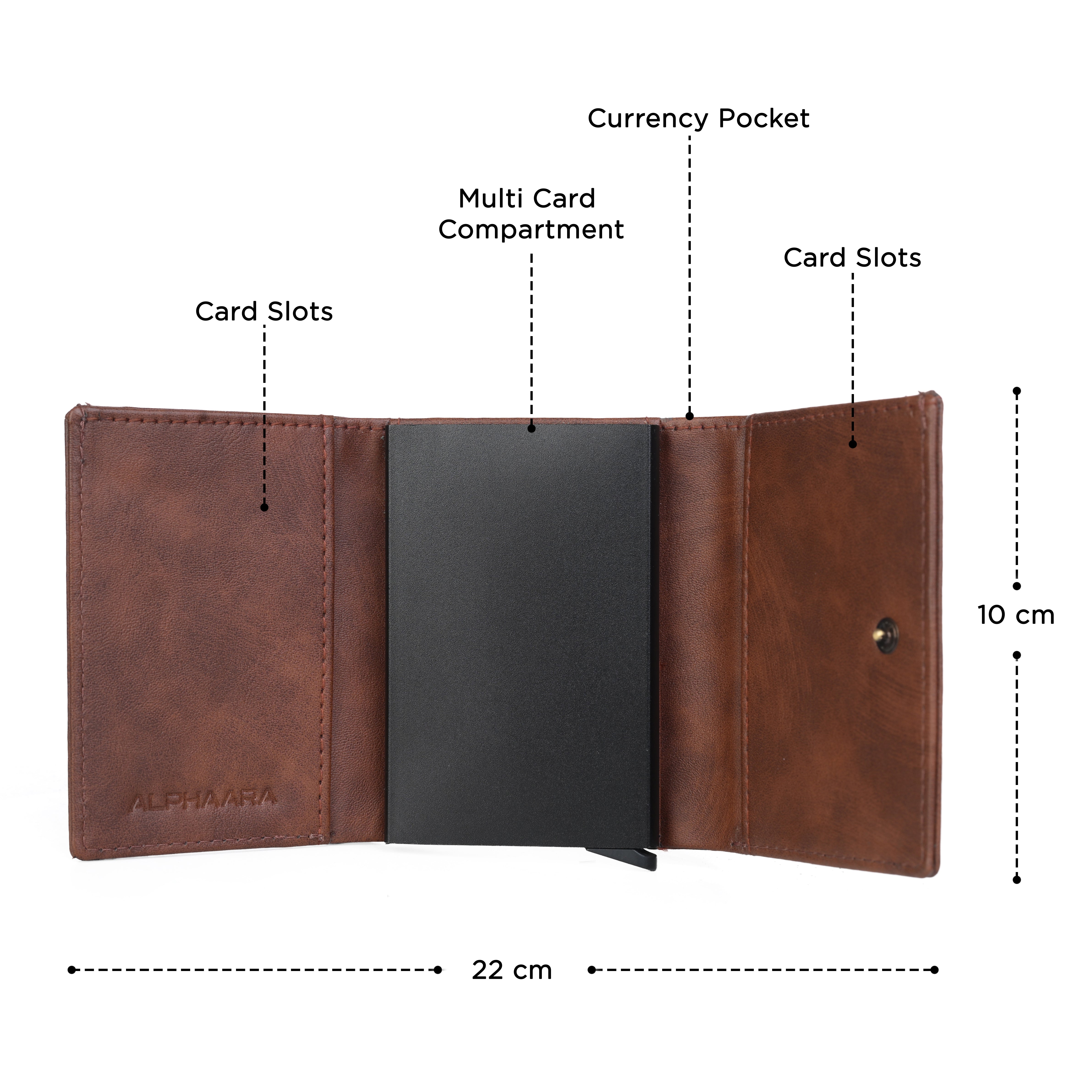 The aluminum card case holds up to 5 essential cards, keeping them secure and protected from RFID theft. On the leather side, thoughtfully designed compartments provide space for additional cards, ID, and folded cash—giving you flexibility without sacrificing a slim profile.